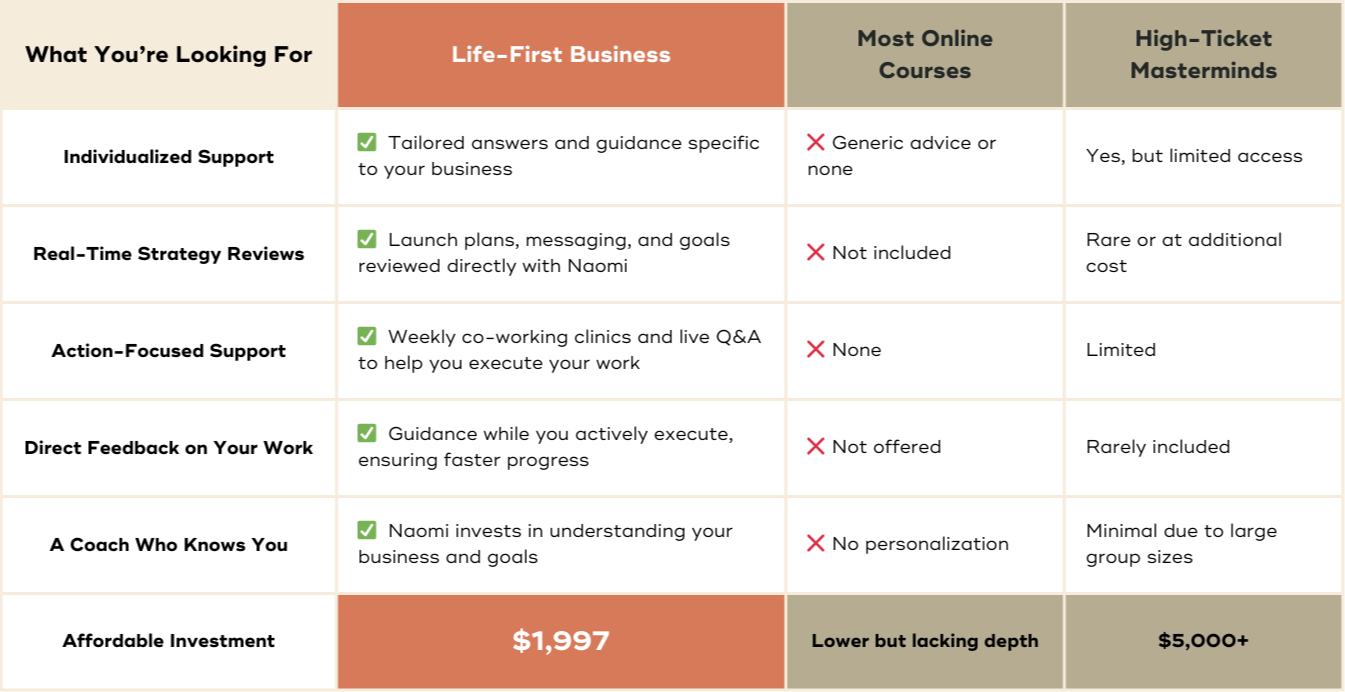 Life-First Business gives you the proven framework and built-in coaching you need to finally earn more, work less, and grow on your terms. And enrollment is open now.