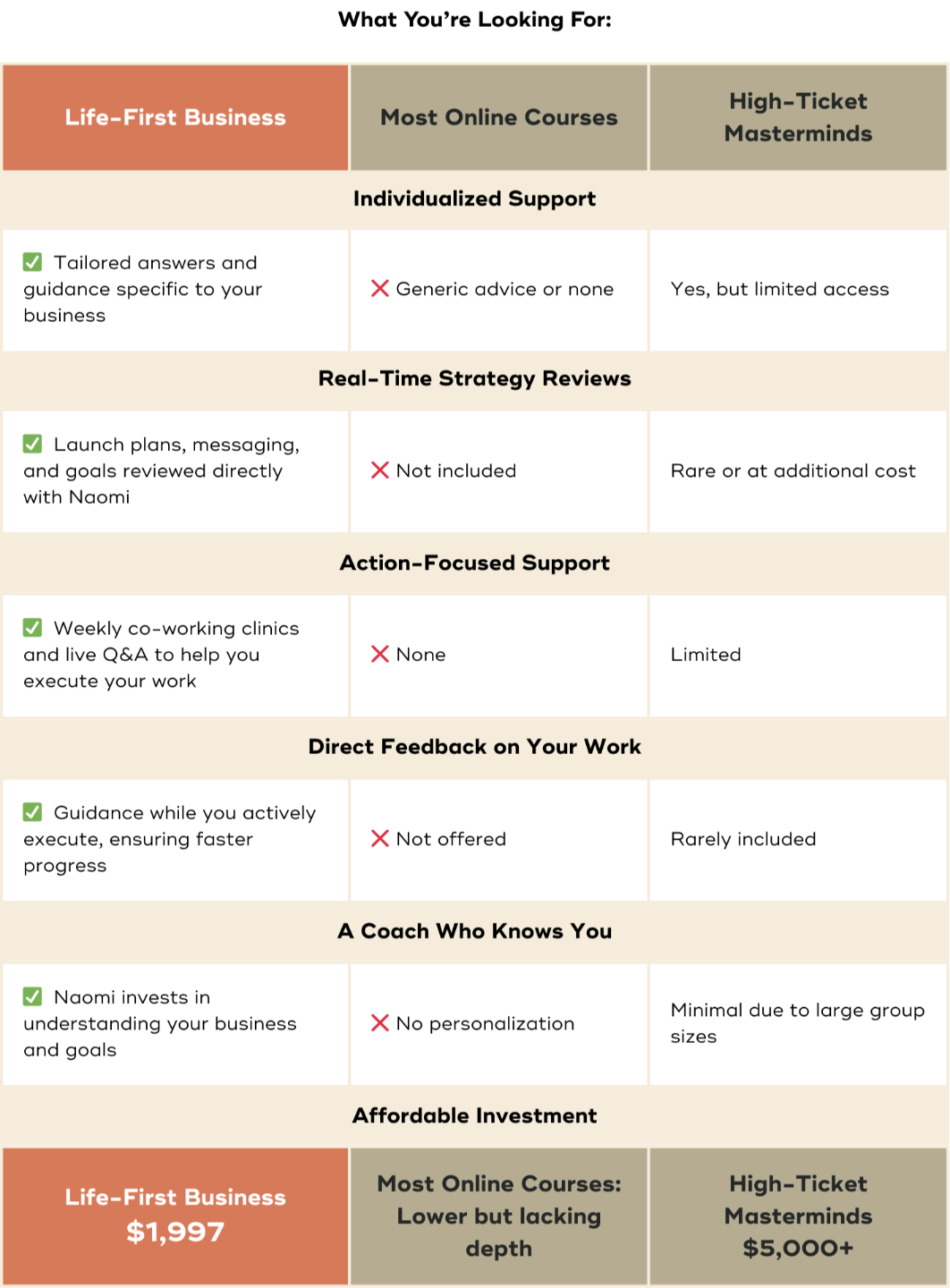 If you were to hire out the strategy, templates, coaching, and support you’ll receive inside Life First Business, it would easily cost you $10,000+ — five times the price of enrollment.